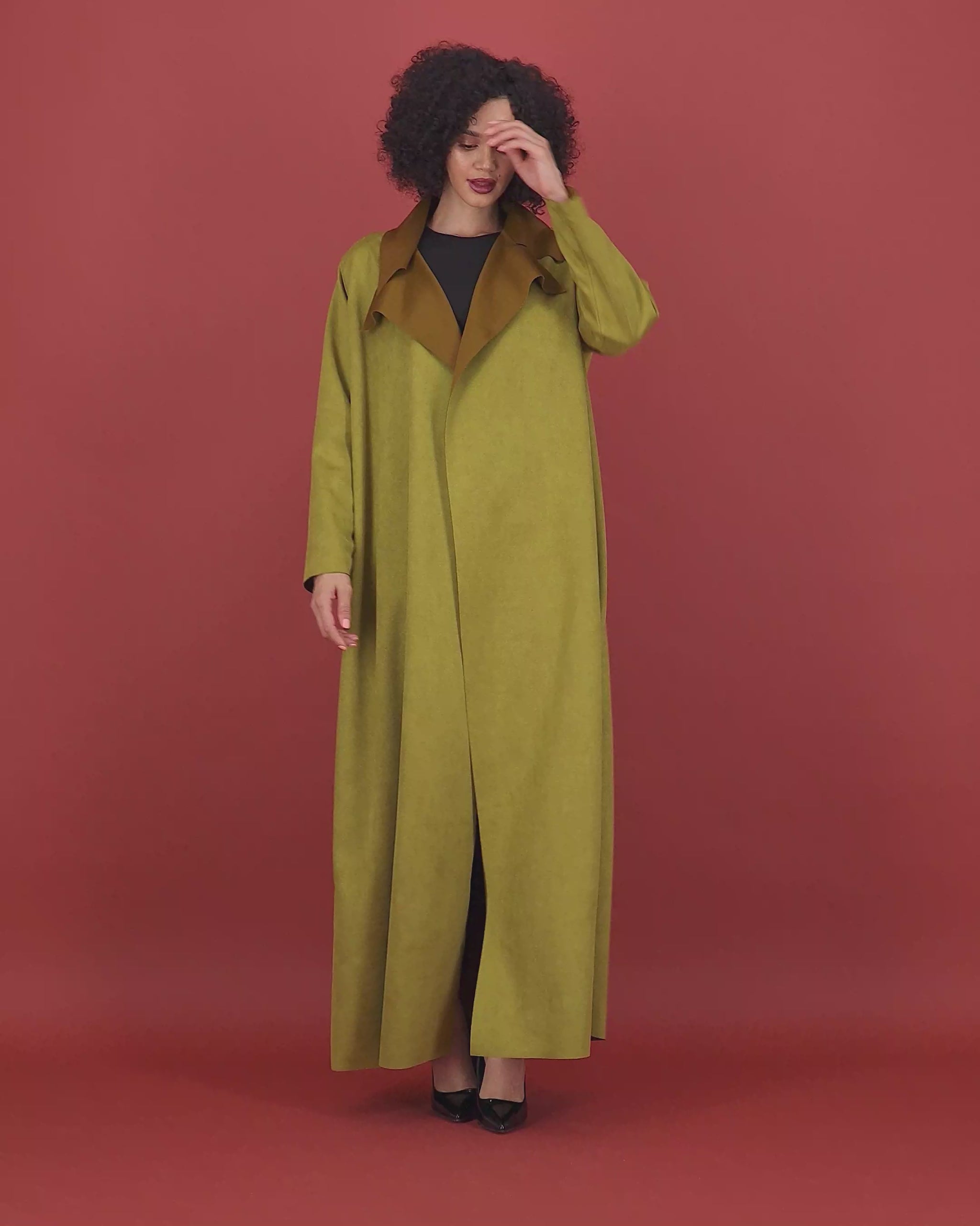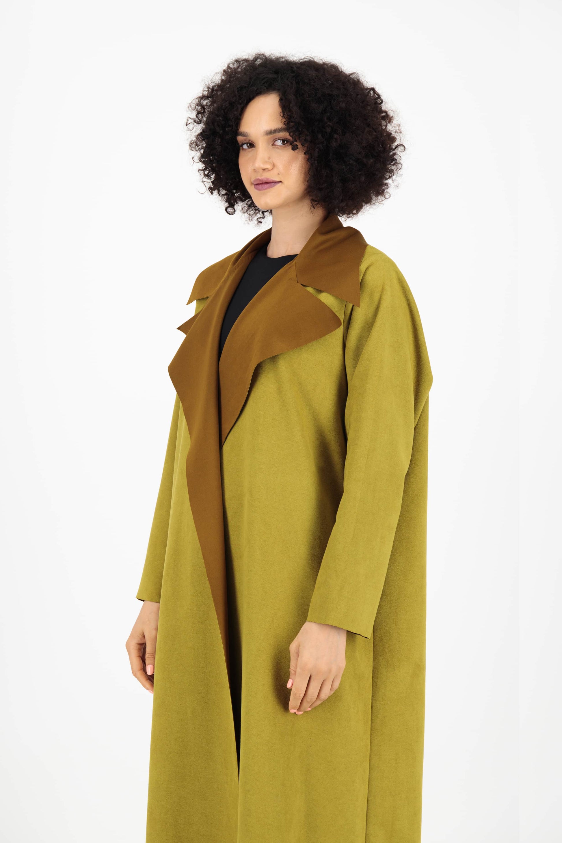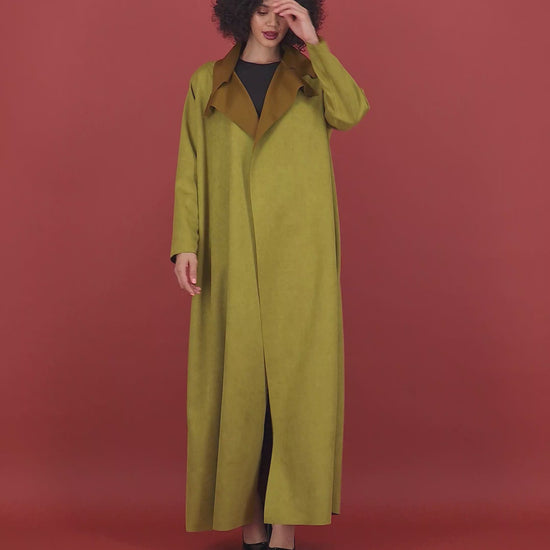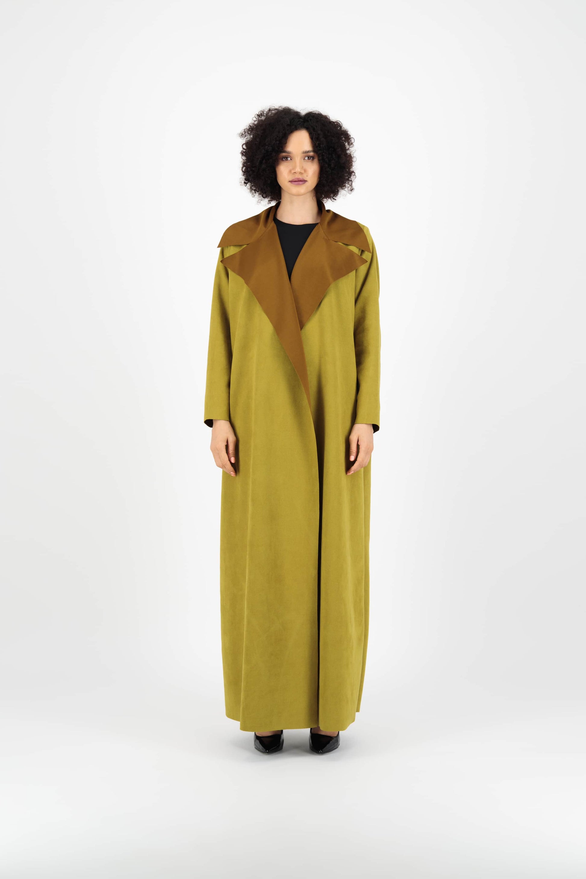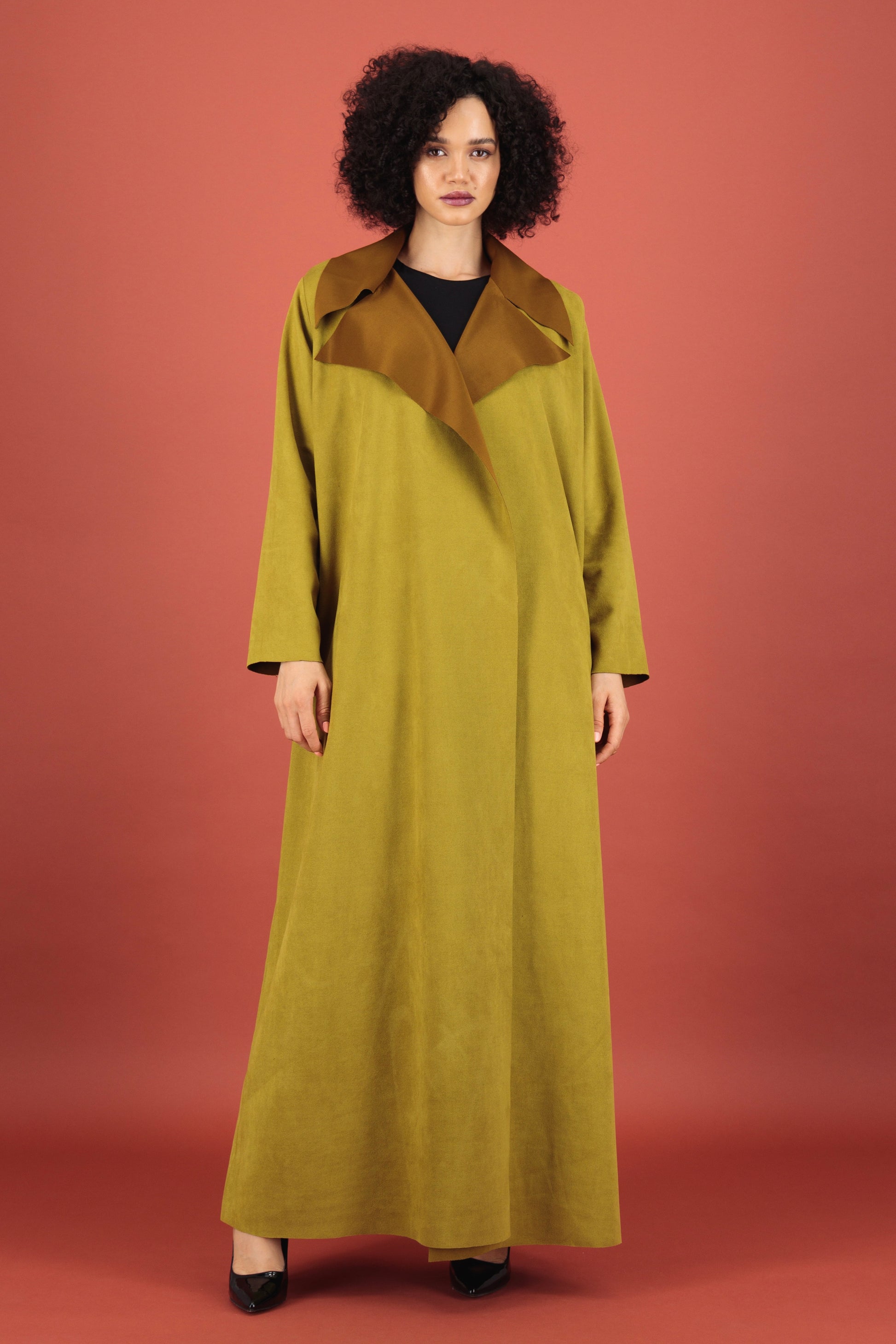 Mustard Suede Trench Abaya. Kindly email us on thelaff.ae@gmail.com for any alteration request.