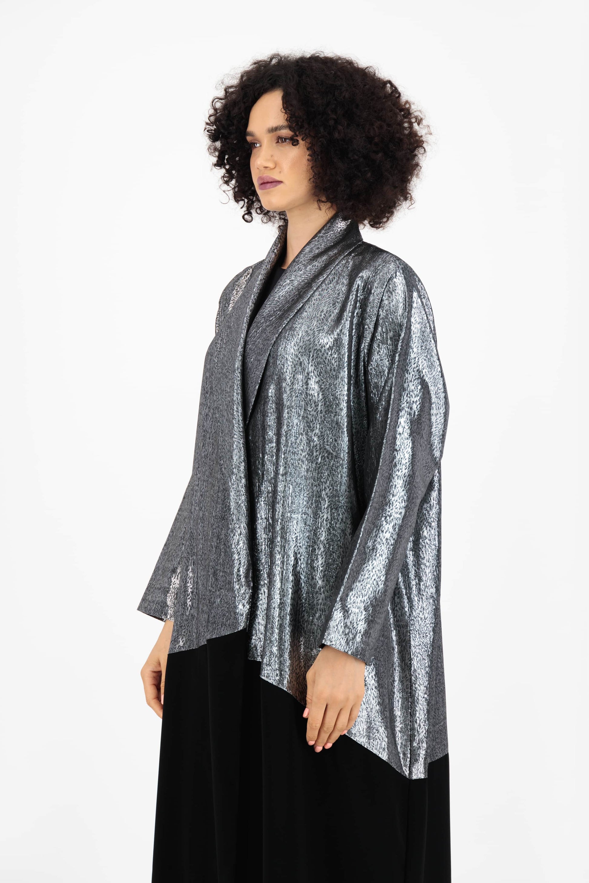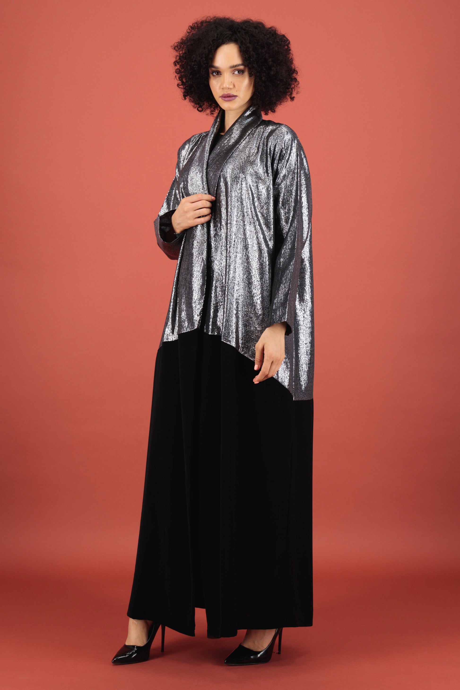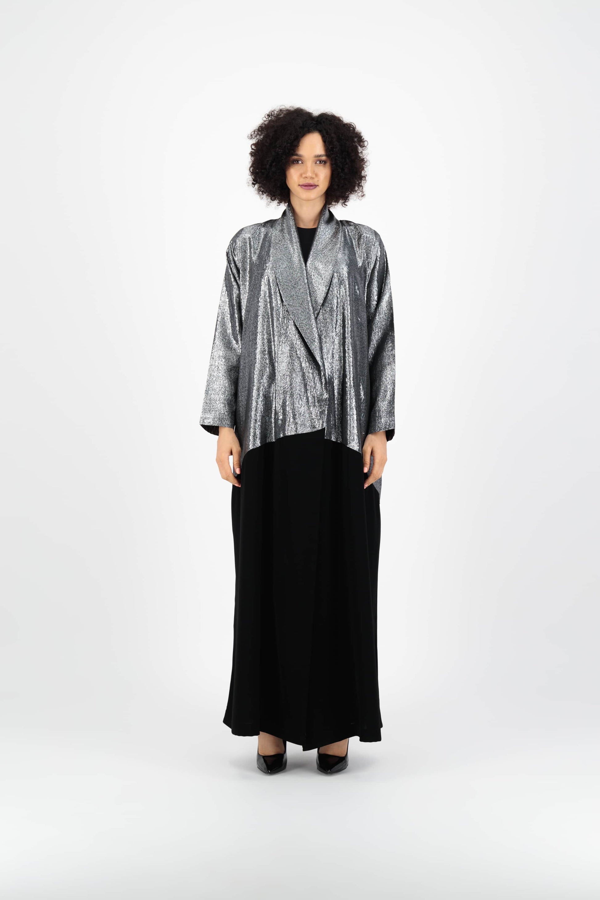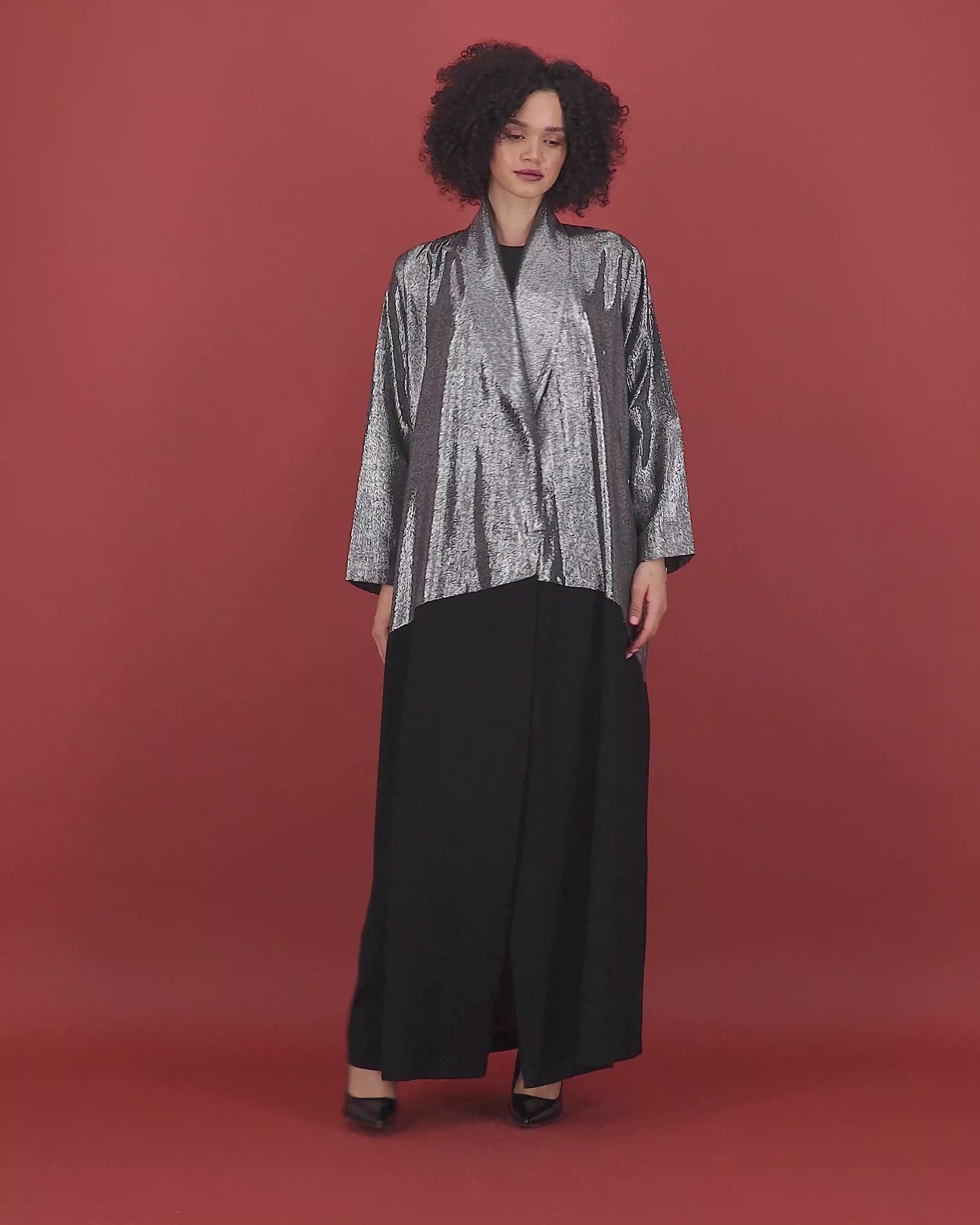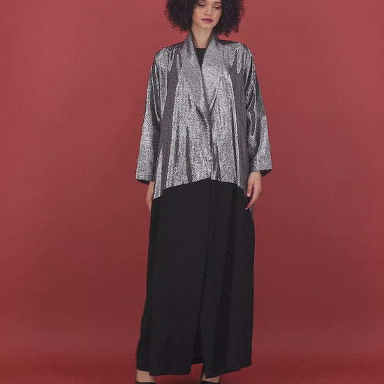 Silver Shimmer / Crepe Abaya. Kindly email us on thelaff.ae@gmail.com for any alteration request.
